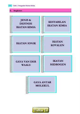 7 Unit 1 : Pengantar Ikatan Kimia D. Rangkuman JENIS & DEFINISI KESTABILAN IKATAN KIMIA IKATAN KIMIA IKATAN IKATAN IONIK KOVALEN GAYA VAN DER IKATAN WAALS HIDROGEN GAYA ANTAR MOLEKUL