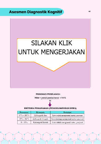 Asesmen Diagnostik Kognitif vii PEDOMAN PENILAIAN= Nilai = Jumlah jawaban benar x 100% 10 KRITERIA PEMAHAMAN (PENGELOMPOKAN SISWA)