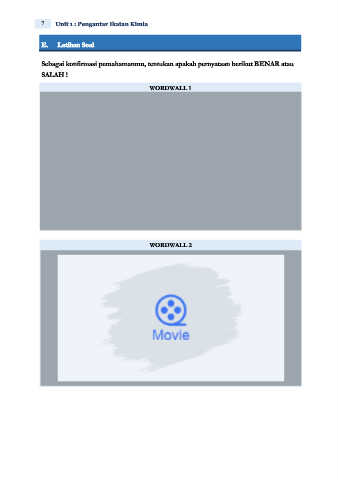 7 Unit 1 : Pengantar Ikatan Kimia E. Latihan Soal Sebagai konfirmasi pemahamanmu, tentukan apakah pernyataan berikut BENAR atau SALAH ! WORDWALL 1 WORDWALL 2
