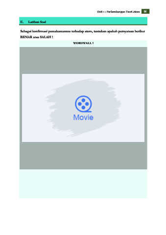 Unit 1 : Perkembangan Teori Atom 16 E. Latihan Soal Sebagai konfirmasi pemahamanmu terhadap atom, tentukan apakah pernyataan berikut BENAR atau SALAH ! WORDWALL 1
